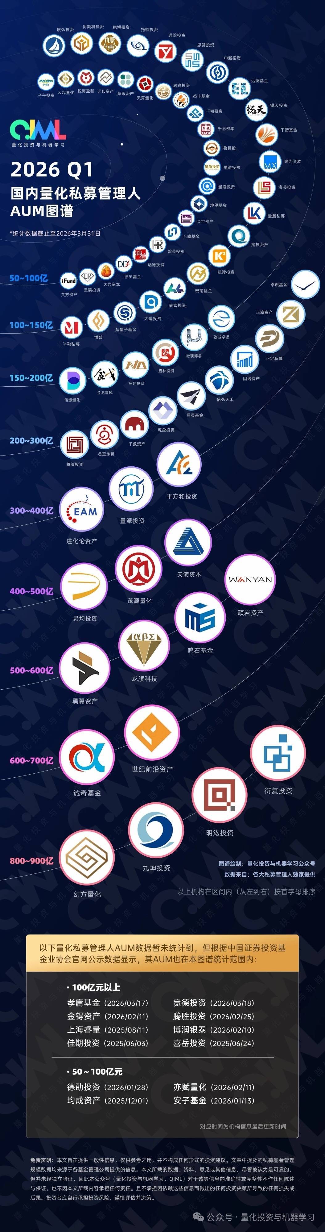 从“量化投资与机器学习”发布的AUM图谱来看,2026年第一季度国内量化私募管理人,各梯队之间的流动性显著增强,头部阵营持续抬升。