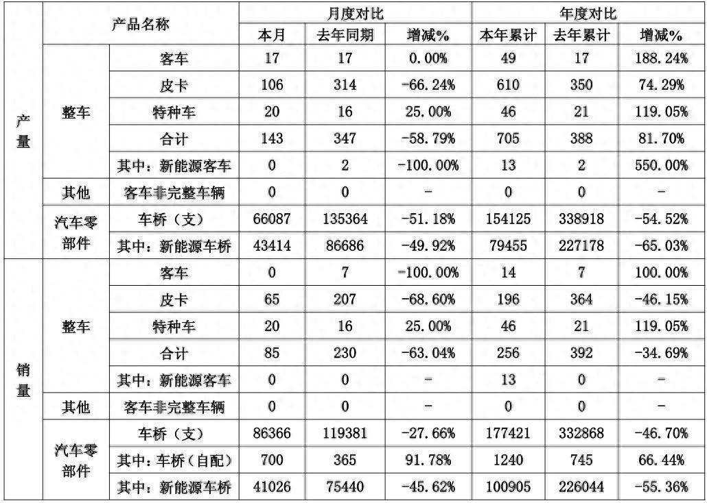 其中,新能源客车3月产量和销售均为0辆,本年累计产量13辆,同比增长550.00%;本年累计销售13辆。客车非完整车辆的产、销量3月均为零。